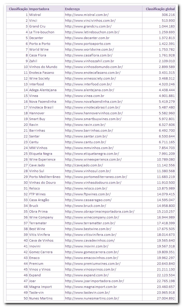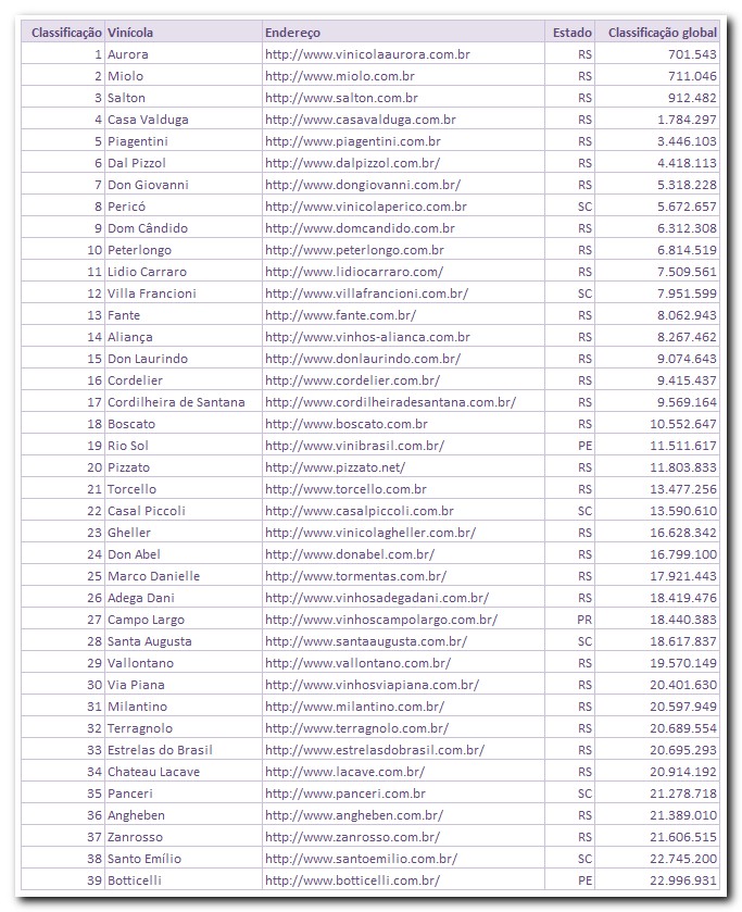 Além disso, o estudo elaborado é uma estatística e não uma contabilidade. O objetivo é fornecer uma visão geral do posicionamento relativo dos diversos sites ligados ao vinho e nisso a análise se saiu muito bem, fornecendo resultados que são inquestionáveis do ponto de vista da expectativa do mercado. Pouquíssimas foram as surpresas.