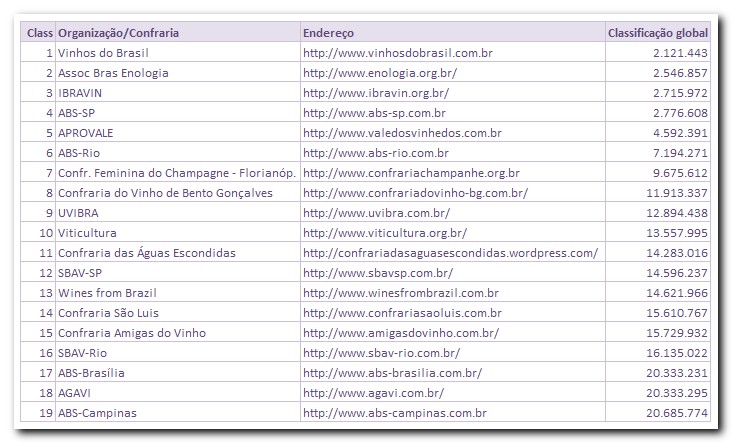 Ótima essa pesquisa Oscar! Excelente o trabalho e muito útil para nós admiradores de vinhos para termos em nossos arquivos de pesquisa. Gostei de ver a simpática confraria da nossa amiga Maria Lucia, a qual tenho o prazer de ser uma das confreiras, figurando como uma das mais visitadas.