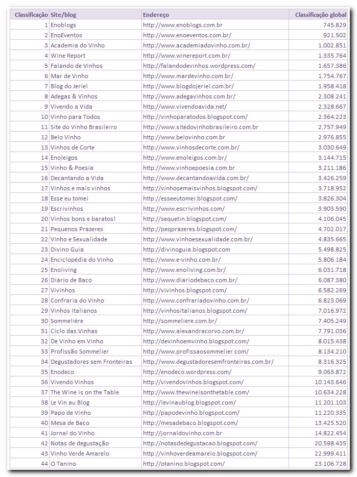 Este trabalho é excelente para todos aqueles que gostam, vendem e propagam o vinho. Fiquei muito feliz em ver a Confraria das Amigas do Vinho e das Águas Escondidas na tabela.