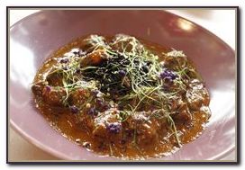 Os Raviolis de lagosta em sopa de citronela e coriandro eram uma mistura requintada e inesperada de ingredientes que bem merece figurar entre "os 100 pratos para comer antes de morrer". Já o Curry de carne ao tamarindo, com arroz negro encheu o salão de aromas exóticos e era uma festa oriental para o paladar. Não resistindo a pedir uma sobremesa, não me arrependi: o Frescor de aloe vera ao limão verde e sorbet de menta apimentado era apenas marginalmente açucarado e sua apresentação, imitando uma caipirinha, mais parecia uma homenagem aos clientes brasileiros. Imperdível!