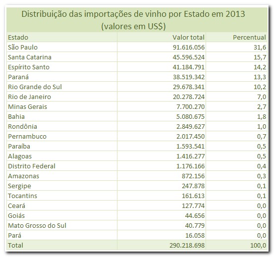 No entanto, na tabela Distribuição das importações de vinhos por estado em 2013, a informação que é utilizada é o estado da sede fiscal da empresa importadora. Note que esses valores não indicam que os vinhos foram ou serão consumidos por lá, mas apenas que eles foram importados por uma empresa com sede naquele estado. Beijo, Oscar |