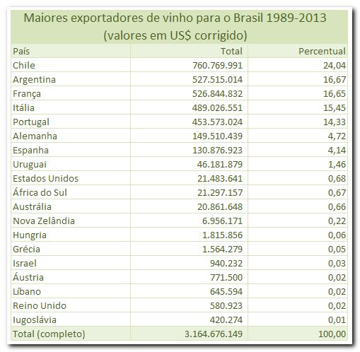 Fernando, os dados do MDIC referem-se apenas a Importação e Exportação de vinhos, sem considerar a produção nacional. O máximo que consegui fazer foi comparar o total das importações com o total das exportações brasileiras. Neste caso, conforme discutido na seção As exportações brasileiras em 2013, nossas exportações equivalem a menos de 5% do valor das importações. Abraços, Oscar |