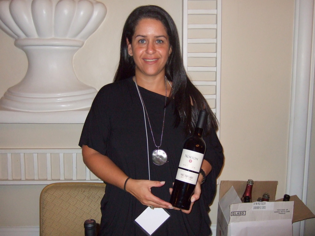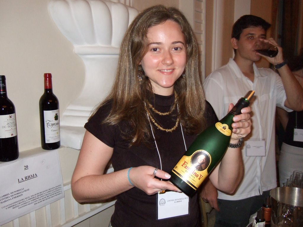 Cynthia, no stand da La Rioja, apresentando o Faustino V |